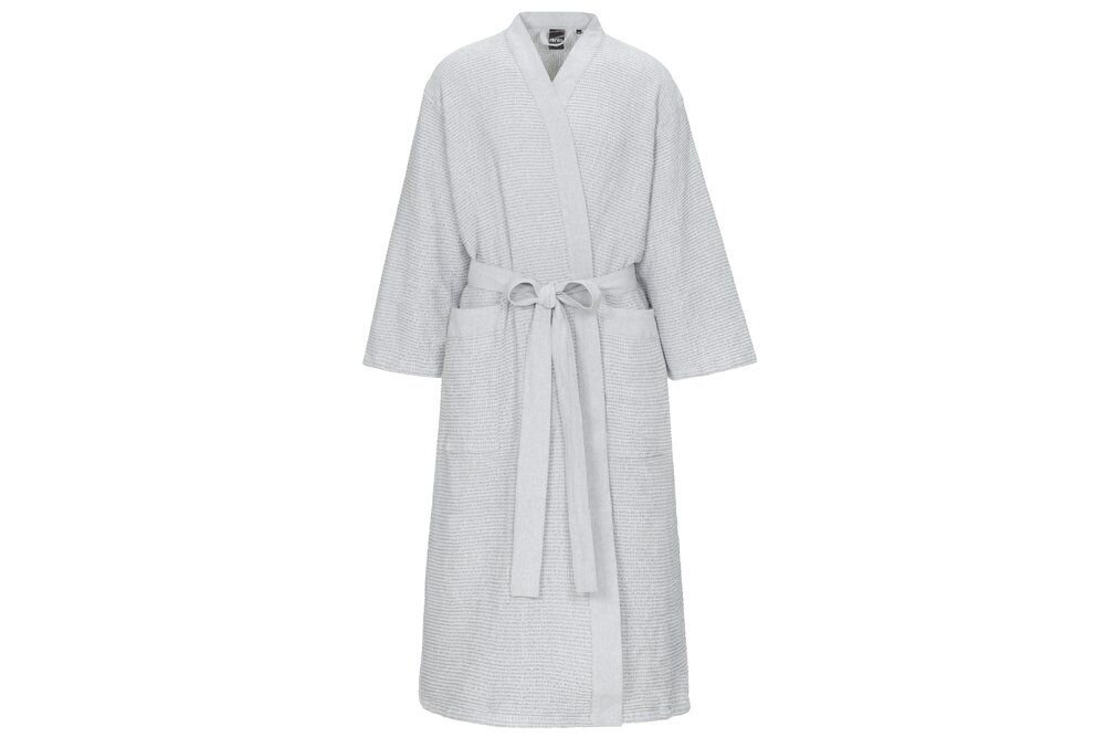 Saunový župan s chambray ramínky a páskem. Recyklovaná bavlněná textilie pro saunu se vyznačuje jemností a vokšinovou strukturou látky.