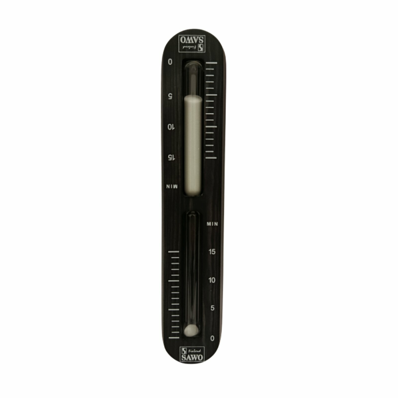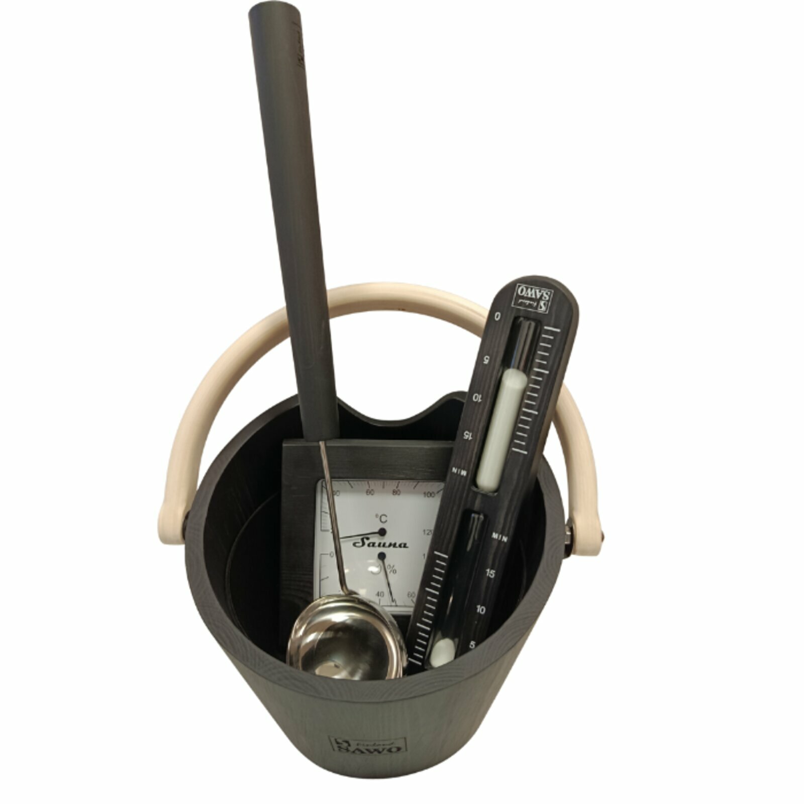 Sada obsahuje vědro s naběračkou, kombinovaný teploměr s vlhkoměrem a přesýpací hodiny do sauny.